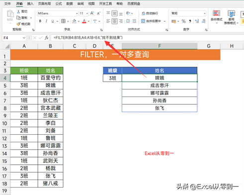 公式:=FILTER(B4:B18,A4:A18=E4,”找不到结果”)
