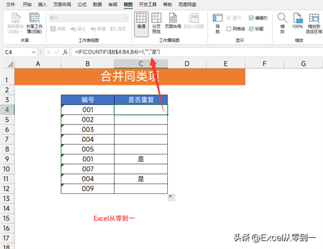 公式:=IF(COUNTIF($B$4:B4,B4)=1,””,”是”)
