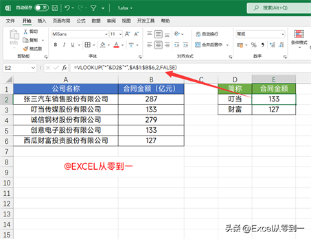 公式:=VLOOKUP(“*”&D2&”*”,$A$1:$B$6,2,FALSE)
