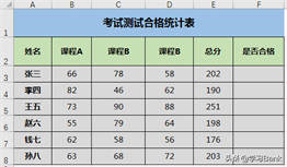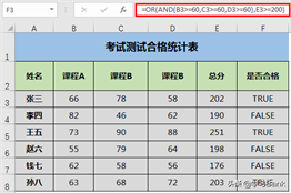 但是总分E3为202分.=200分,则为合格。函数为“=OR(AND(B3>=60,C3>=60,D3>=60),E3>=200),这样返回值为TRUE(真)。依此类推。