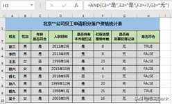 以张三为例,单元格C3、E3、F3、G3均为真时符合,有一项为假时不符合,则函数为“=AND(C3=”是”,E3=”是”,F3>=7,G3=”无”)”,这样返回值为“True”符合。依此类推。