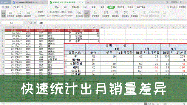 这里,举一个常用案例,源表是某服装店的销售明细表,通过使用透视表,就能轻松分析出月销量的差异情况: