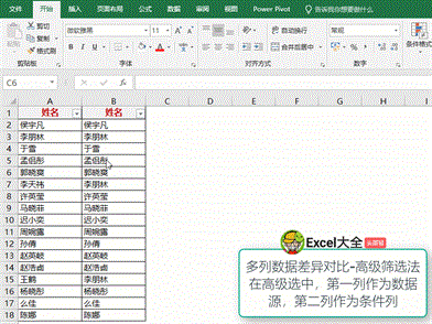 步骤:菜单选择”数据”-“高级筛选”-面板中,设置基准列和数据源,如下动画教程: