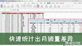 在源表上插入透视表 -> 调整布局:拖拽月份至列区域,拖拽商品名称至行区域,拖拽两次销量至值区域(一个用于统计值,一个用于统计差异) -> 在值区域第二个统计值上右键菜单,选择“值显示方式”-“差异”