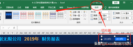 日常中,我们见到的切片器大多是这样的颜色的,这些都是系统根据【主题色】自带的模板颜色。它们在选中切片器时,在【切片器工具】中就能找到对应的【切片器样式】。