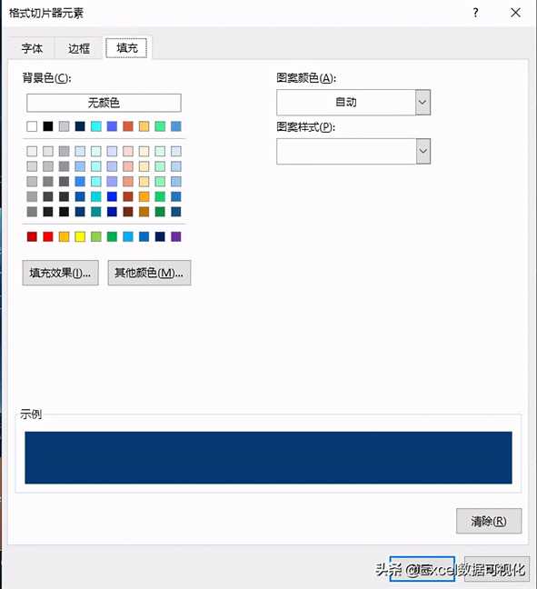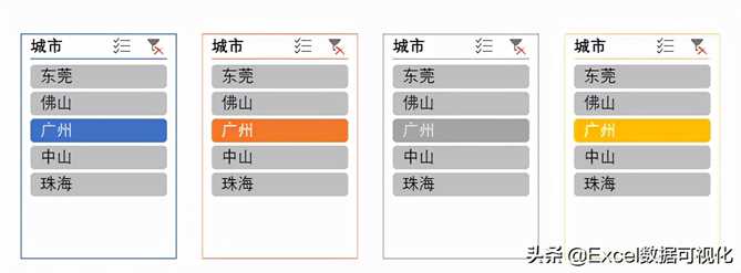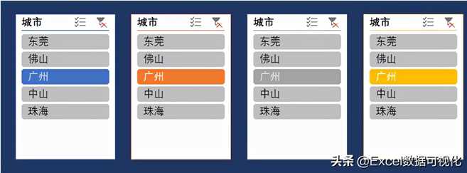 对切片器设置主要设置【字体】【边框】【填充】颜色,3个颜色设置,这里我们边框均设置无。由于是深色的背景,所以统一设置了白色的字体。