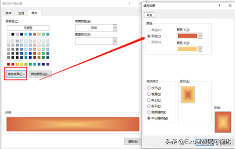 带有数据的项目,也就是切片器呈现高亮颜色的那部分内容,在【字体】修改字体颜色为白色。这里选择【填充】,在【填充效果】选择到双色,橙色与黄色交叉。