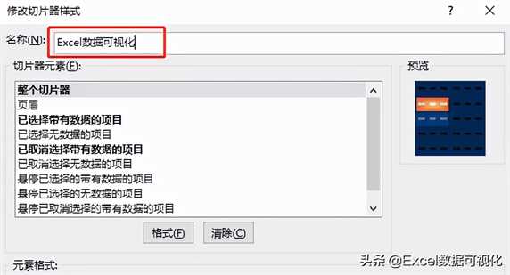 除了以上三项之外,其他的元素根据需要选择设置。修改后样式,我们可以给样式命名,如【Excel数据可视化】,接着保存。