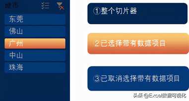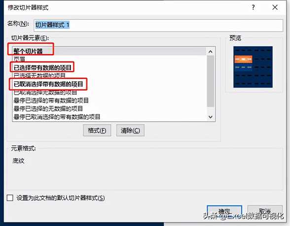 切片器中有许多选项,必须要修改的样有三样:①整个切片器;②已选择带有数据项目;③已取消选择带有数据项目
