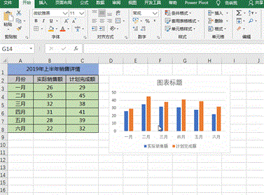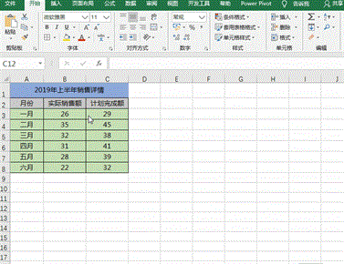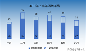 源数据为2019年1月到6月的销售综计数据,其中第1列数据为实际销售额,第2列为计划完成的销售额。