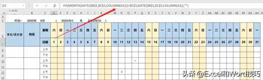这里在单元格中输入公式=IF(MONTH(DATE($B$5,$C$5,COLUMN(A1)))=$C$5,DATE($B$5,$C$5,COLUMN(A1)),””)