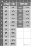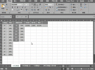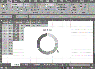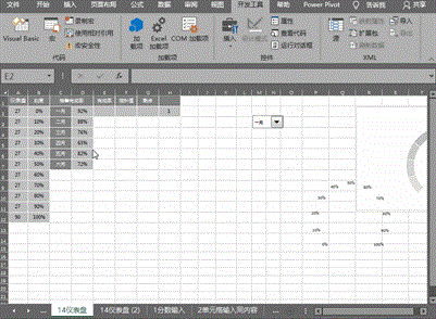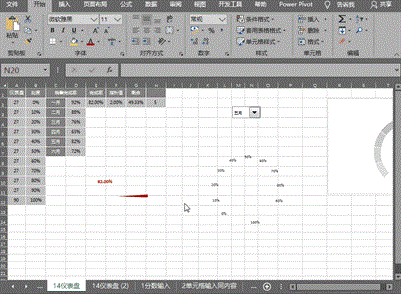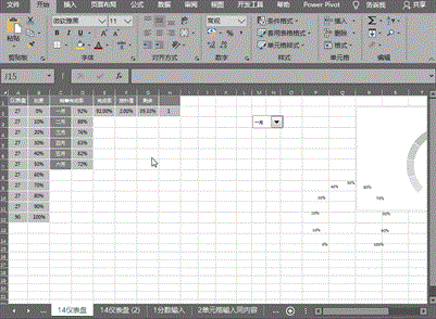 设置随着控件按钮选择时完成率的变化:在完成率的E2单元格中键入公式==INDEX(D2:D7,H2,1),指针值中设置固定值2%,剩余中设置为=100%*360/270-E2-F2(请见后文释义);