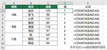 同理D5:D7皆返回数字2;D8:D10皆返回数字3…..
