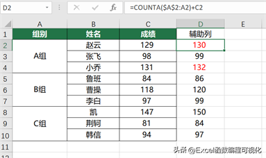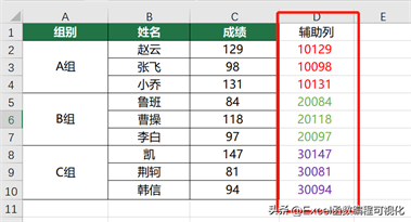 下图是没乘10的4次方结果,如果升序出的话,数字130/132肯定会排列到底部C组,导致姓名、组别对应错误。