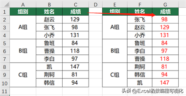 也就是说,无论如何升序,A组的数据不会跑到B组下面(因为没人家大)、B组的数据不会跑到C组下面,从而保证了各小组的排名只会在组内进行变动。