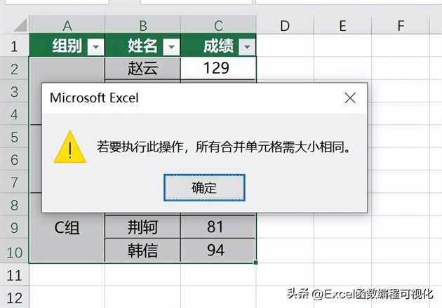 如果我们直接筛选排序的话,Excel会报错,提示【若要执行此操作,所有合并单元格需大小相同】,直接筛选方法行不通。
