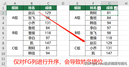这样,即使最后一步升序的时候不带上A列(合并单元格列),其对应的姓名、成绩也不会发生错位。