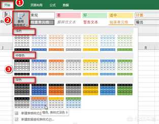选中单元格,点击“开始”菜单下的“套用表格格式”,这里提供了浅色、中等色和深色三种级别的颜色样式,不喜欢Excel自带的表格格式,可以点击这个界面上的“新建表格样式”创建属于自己的样式。