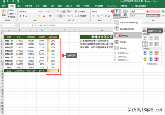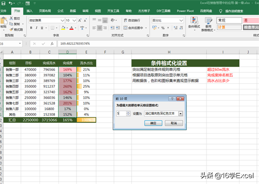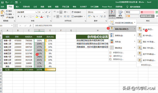 2.根据项目选取原则突出显示单元格:完成度排名前五