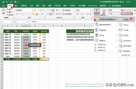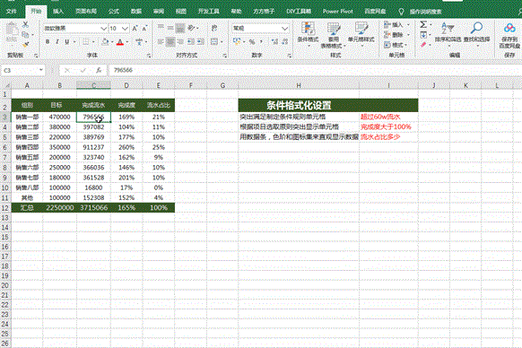 最佳答案下面以三个小案例,对单元格进行条件设置。 1.突出满足制定条件规则单元格:超过60w流水操作步骤:选择数据范围→开始菜单栏→条件格式→选择大于→输入数值 2.根据项目选取原则突出显示单元格:完成度排名前五操作步骤:选择数据范围→开始菜单栏→条件格式→选择前10项→将1......