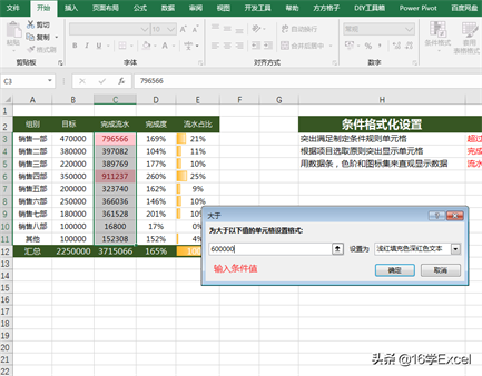 1.突出满足制定条件规则单元格:超过60w流水