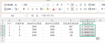 点击F2单元格,输入公式=(D2-C2)/C2,回车确认后,同样双击填充柄向下填充,即可得到各店铺的同比增长率。