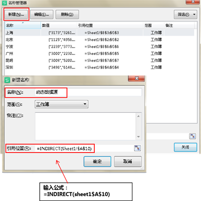 选中A10单元格,单击菜单栏“公式”选项卡,选择“名称管理器”,选择新建,,名称设置为“动态数据源”,引用位置,输入公式:=INDIRECT(sheet1$A$10)。