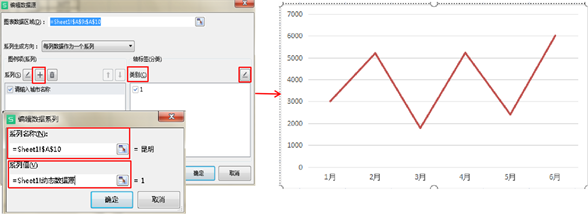 选中图表,右键选择数据,添加系列,系列名称选择A10所在单元格,系列值输入”=sheet1!动态数据源”,类别—“轴标签区域”选择B1-G1所在行,确定。