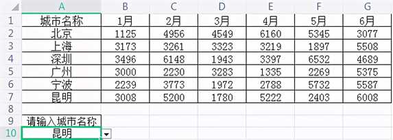 A9单元格输入“请输入城市名称”,单击A10单元格,选择“数据”—有效性,有效性条件,“允许”选择序列,“数据来源”选择A2-A7单元格所在数据。