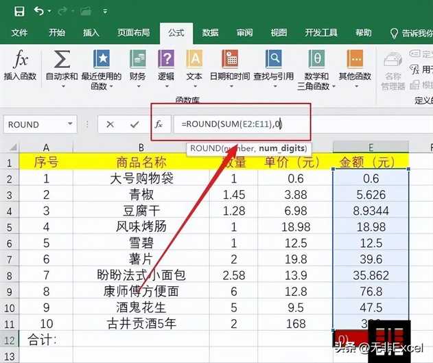 如下图所示,如果公式更改为:=ROUND(SUM(E2:E11),0),则表示取整到个位。