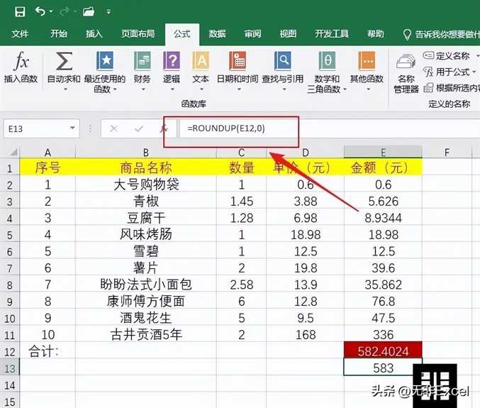 如下图所示,结果为583,不管小数部分是多少,都一律向上舍入。