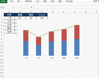 最佳答案 1,在数据源表格中,增加Total数据列 具体操作如下: 2,制作堆积柱形图 根据数据源表格数据(A1:D6),制作一张堆积柱形图具体操作如下: 3,修改图表类型 将“Total”数据列的数据类型,修改为折线图具体操作如下: 4,对折线图添加数据标签 对折线图添加数据标签,同时,将标签的位置设置为......