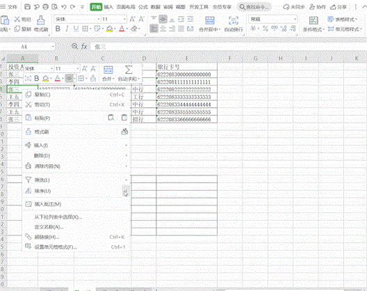 2、选中A列姓名,单击:开始选项卡下的合并相同单元格。同样,我们对银行卡号也是如此操作。