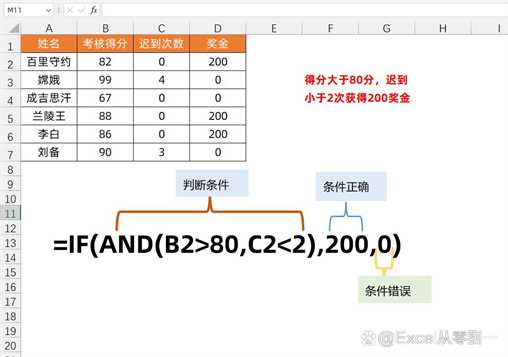 如下图所示,我们要求考核得分大于80且迟到次数小于2次,才能获得200元奖金,其余的情况均不获得奖金。因为要求两个条件同时满足,所以我们需要使用and函数来构建条件。