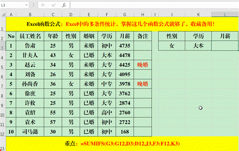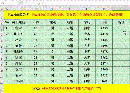 在目标单元格中输入公式:=IF(AND(C3>30,E3=”未婚”),”晚婚”,””)。