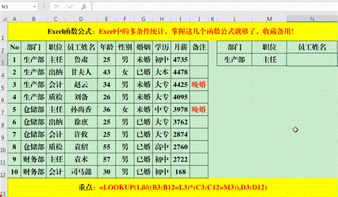 在目标单元格中输入公式:=LOOKUP(1,0/((B3:B12=L3)*(C3:C12=M3)),D3:D12)。