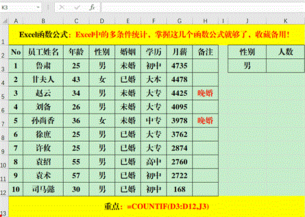 在目标单元格中输入公式:=COUNTIFS(D3:D12,J3,F3:F12,K3)。