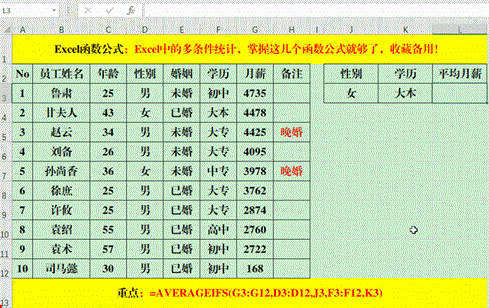 在目标单元格中输入公式:=AVERAGEIFS(G3:G12,D3:D12,J3,F3:F12,K3)。