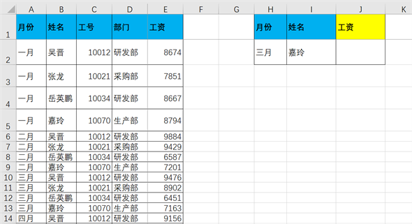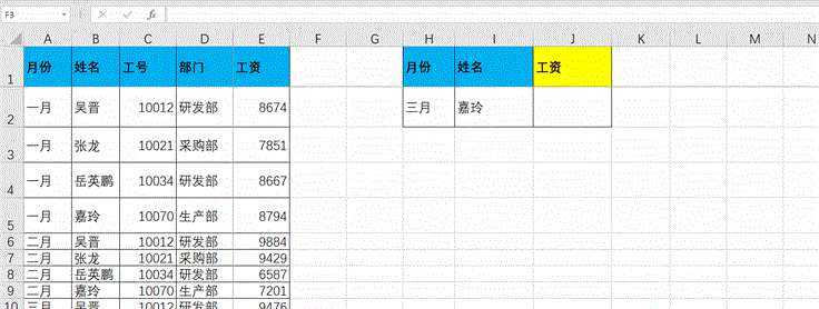 如下图,我们要查询三月份嘉玲的工资。条件1为三月, 条件2为嘉玲, 查询结果为工资。