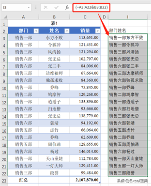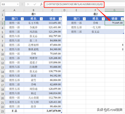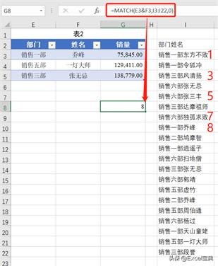 解读公式:E3&F3的计算结果为:销售一部乔峰。此公式可以解读为:在I3:I22区域中匹配“销售一部乔峰”,匹配方式为精确匹配。找到后返回该值在上述区域中的位置(相对行次)。