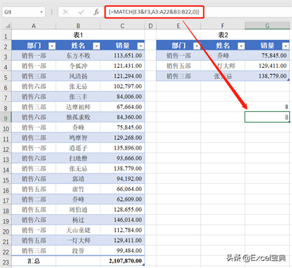 核心公式:=MATCH(E3&F3,A3:A22&B3:B22,0)的计算结果为8,