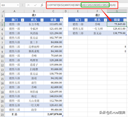 最佳答案现在我们一起学习第二种方法:OFFSET+MATCH举例:根据下图表2中E3:F5的已知条件,在表1中找到对应的销量。图1建立外层公式如图2,以销售一部的乔峰为例,他的销量在C10单元格,如果以C2为基准点,则应向下偏移8行。在G3单元格中输入简化公式:=OFFSET($C$2,8,0)解读公式:以......