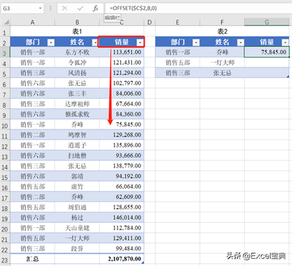 如图2,以销售一部的乔峰为例,他的销量在C10单元格,如果以C2为基准点,则应向下偏移8行。