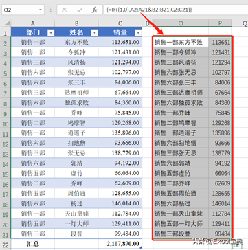 为了验证IF函数的计算结果,在图5中选择O2:P21单元格区域,输入数组公式:=IF({1,0},A2:A21&B2:B21,C2:C21),按Ctrl+Shift+Enter,即可显示IF函数的计算结果。可以看到与图3的效果一致。