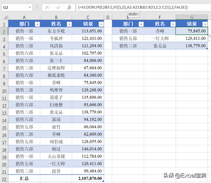 最终显示效果:{=VLOOKUP(E2&F2,IF({1,0},A2:A21&B2:B21,C2:C21),2,FALSE)}