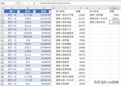 原因在于,VLOOKUP匹配顺序为自上而下,且只返回匹配到的第一个值,本例中要匹配的是销售三部张无忌的销量,但是因为销售六部张无忌在其上面,所以匹配到的是六部张无忌的销量,导致结果错误。