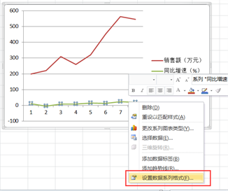 第二步:选中“同比增速”数据,右键点击,选择设置数据系列格式