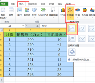 第一步:选中数据源,点击插入——图表——选择折线图(也可以是其他类型图表),建立一个单坐标轴图表。