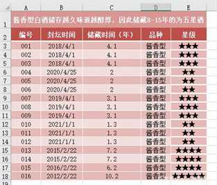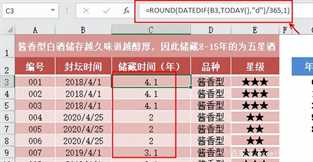 在这个表格数据中,储藏时间是通过日期差函数来求解的,公式为:=ROUND(DATEDIF(B3,TODAY(),”d”)/365,1)