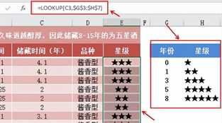 这个lookup函数讲了很多次,它的主要作用就是查找引用,特点是可以进行区间匹配,就比如上面的公式,直接引用了这个辅助区间,便计算出此年份对应的星级。